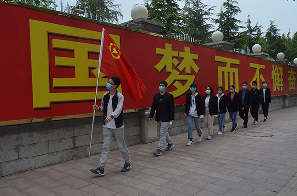 上午九点,团员们高举着团旗,排着整齐的队伍精神饱满地徒步前往石家庄解放纪念碑,历时一个小时二十分钟,到达目的地。只见由七块高低错落的石板形成的主碑耸立在眼前,最高的石板高达33米,直冲云霄,象征着我军解放全中国的士气与魄力。来到纪念碑下,大家用默哀的方式来表达对先烈们的哀思。每个人都装容严整,静穆肃立,眼神中充满对英雄的崇敬之情。